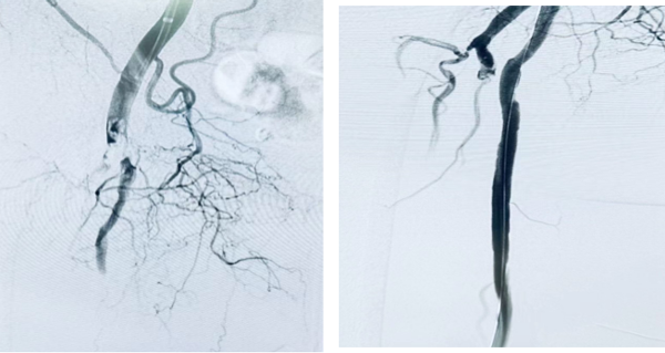 颈动脉狭窄采取腔内治疗的方式,通过股动脉穿刺置入血管鞘后,由股动脉置入造影导管,造影明确颈动脉狭窄情况,导丝选入颈动脉病变远端,沿导丝置入保护伞,沿保护伞导丝置入球囊预扩张病变,随后置入颈动脉支架,造影明确支架定位,准确释放颈动脉支架。造影见颈动脉狭窄消失,管腔恢复畅通。缝合穿刺点,患者术后24h可正常下地活动。