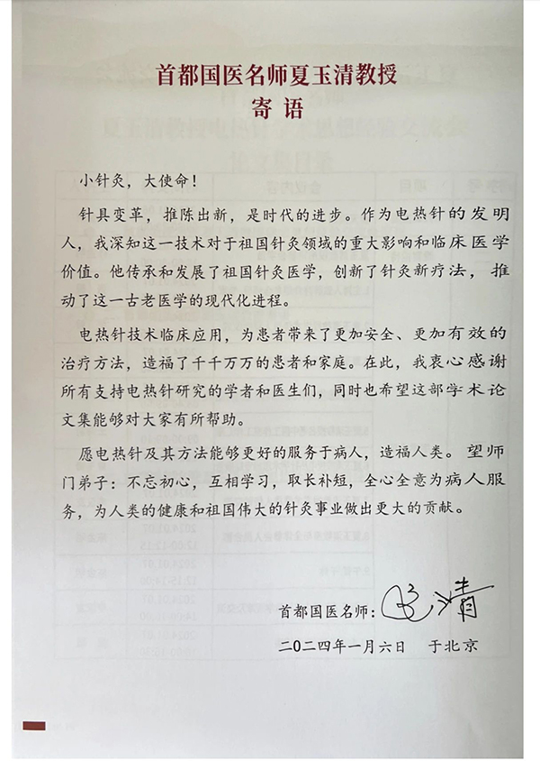 夏玉清同志的一生,是勤勤恳恳为患者服务的一生,是为电热针事业创立发展奉献的一生!夏玉清同志虽已远去,但风范长存。她以精湛医术为患者驱散病痛阴霾,用发明电热针疗法为针灸领域添砖加瓦,凭倾囊相授为中医传承播撒火种。我们缅怀她,致敬这位大医精诚的楷模,愿其精神永绽光芒,激励后学奋进不止!