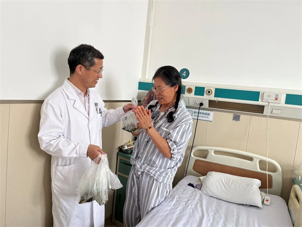 眼科主任、支部书记周尚昆带领科室医护人员逐一向患者赠送香囊及五彩绳,祝福他们早日康复,看清望远,一生平安。来自内蒙古、黑龙江、新疆、广东、贵州等全国各地的患者对望京医院眼科的医疗质量和人文关怀赞不绝口,认为这么好的资源应该共享和推广,建议眼科扩大宣传、扩大规模。患者朋友们也表示医护人员真的很辛苦,发自内心地祝福医护人员身体健康。