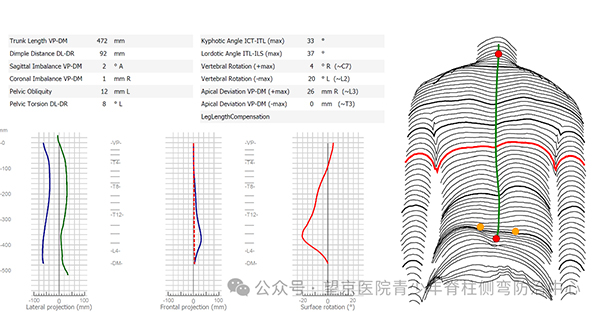 数字化椎体旋转角测量仪采用先进的内置高精度传感器和位移轨迹定位技术,结合专业算法,15秒内快速完成脊柱形态评估,提供Cobb角、ATR角、脊柱曲度、脊椎旋转角度、骨盆变化等关键参数,全面了解脊柱健康状况。
