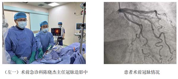 患者既往患有冠状动脉粥样硬化性心脏病、心律失常、高血压、高脂血症、精神障碍等多种疾病,术前急诊陈晓杰主任为患者实施冠脉造影,结果显示冠状动脉三支病变——LAD中段狭窄约50%,LCX远段严重狭窄约90%,RCA中段狭窄约80%,心脏不良事件风险极高。但患者髌骨骨折术后23年,内固定物已暴露于体外,若不及时手术,随时可能出现感染,甚至危及生命安全。一道两难的选择题摆在面前:若术前处理冠脉狭窄,则干预后必须抗血小板治疗,手术必须延期,感染风险会持续加剧;若不处理冠脉,选择即刻手术,则围术期出现心脏恶性事件的几率大增。陈晓杰主任与创伤骨科孙研主任密切沟通,考虑手术紧急,决定术前暂不干预。