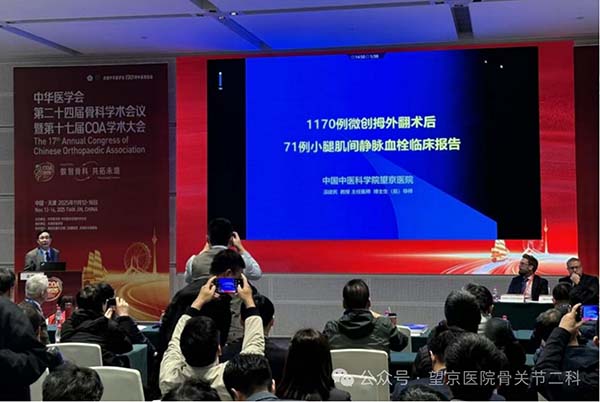 国家级名老中医、首都名中医、中国中医科学院望京医院骨关节二科温建民教授受邀出席本次盛会,并于11月13日上午的足踝会场带来重磅学术分享。温建民教授以《1170例微创拇外翻术后71例小腿肌间静脉血栓临床报告》为主题展开专题演讲,凭借数十年临床实践积累与系统性研究沉淀,深入剖析了微创拇外翻手术中小腿肌间静脉血栓这一关键并发症的发生规律。演讲中,他详细呈现了1170例大样本临床案例的完整数据链,从患者年龄、术前基础疾病、手术操作细节到术后康复干预等多维度,精准梳理了71例血栓病例的危险因素,同时分享了中西医结合预防与干预的创新方案,提出“辨证施护、早期介入、内外兼治”的特色防控策略,为降低术后血栓发生率、提升微创治疗安全性提供了宝贵的临床依据,引发现场中外专家热烈讨论与高度认同。