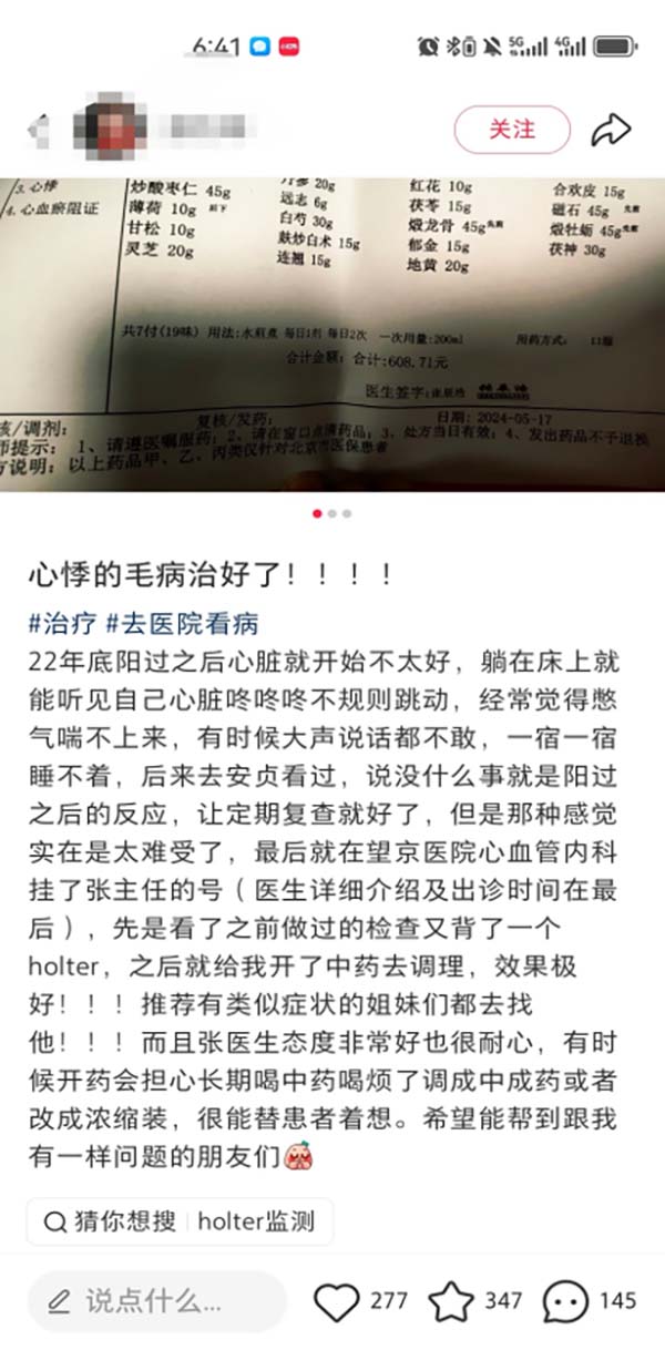“阳过之后心脏一直不舒服,心慌、睡不着,检查又没事……后来找到张主任,开了中药调理,效果极好!而且他特别耐心,还会根据情况调整剂型,真的很为患者着想。”