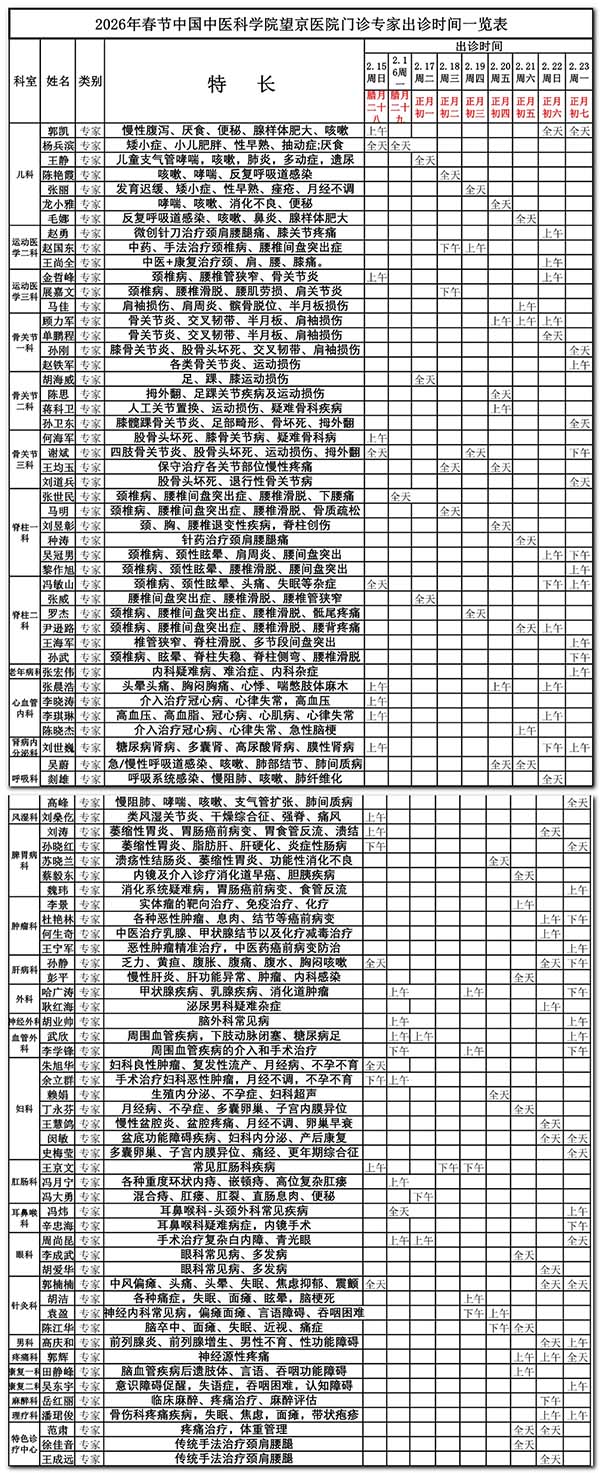 望京医院春节不打烊,专家出诊表如下: