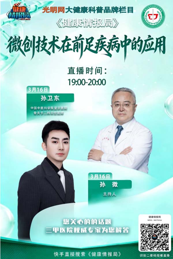 3月16日(周一)19:00,望京医院骨关节二科主任医师孙卫东为您带来:微创技术在前足疾病中的应用,敬请关注本期精彩直播!