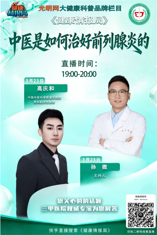 3月23日(周一)19:00,望京医院男科副主任医师高庆和为您带来:中医是如何治好前列腺炎的,敬请关注本期精彩直播!