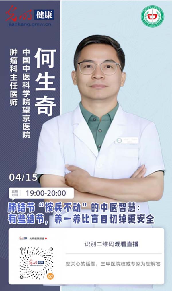 4月15日(周三)19:00,望京医院主任医师何生奇为您带来:肺结节“按兵不动”的中医智慧。敬请关注本期精彩直播!