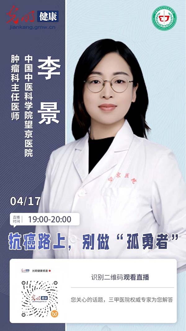 4月17日(周五)19:00,望京医院执行主任、主任医师李景为您带来:抗癌路上,别做“孤勇者”。敬请关注本期精彩直播!