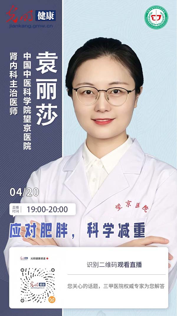 4月20日(周一)19:00,望京医院主治医师袁丽莎为您带来:应对肥胖,科学减重。敬请关注本期精彩直播!