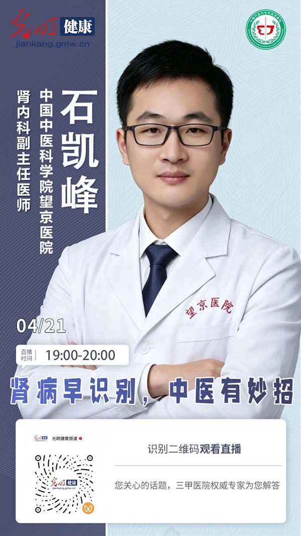 4月21日(周二)19:00,望京医院副主任医师石凯峰为您带来:肾病早识别,中医有妙招。敬请关注本期精彩直播!