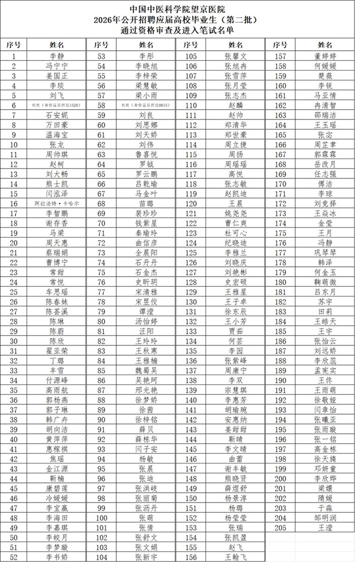中国中医科学院望京医院2026年公开招聘应届高校毕业生(第二批)通过资格审查名单及笔试的相关通知
