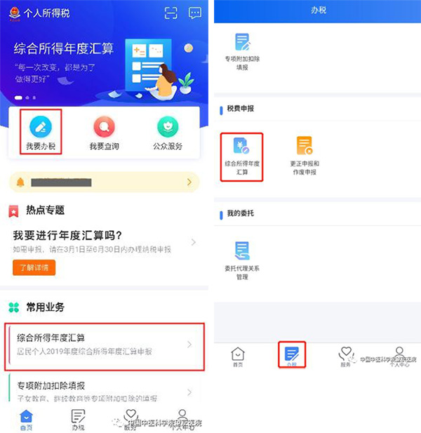 使用手机APP 端申报,您可以从以下入口进入年度汇算:一是从首页的【常用业务】区块的【综合所得年度汇算】进入;二是从【快捷入口】-【我要办税】下或底部【办税】菜单进入后,点击在【税费申报】下的【综合所得年度汇算】。