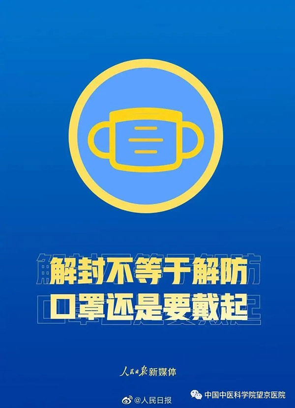 解封不等于解防!现在仍未到放松的时候。防控见成效但病毒未降伏,一时大意可能前功尽弃。打开城门不是打开家门,少串门少聚集,口罩、洗手、分餐依然要牢记。转发倡议,珍惜来之不易的防疫成果,切莫放松警惕!