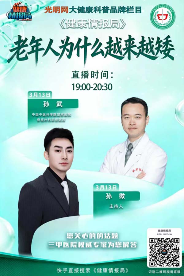 3月13日(周五)19:00,望京医院脊柱二科主任医师孙武为您带来:老年人为什么越来越矮,敬请关注本期精彩直播!